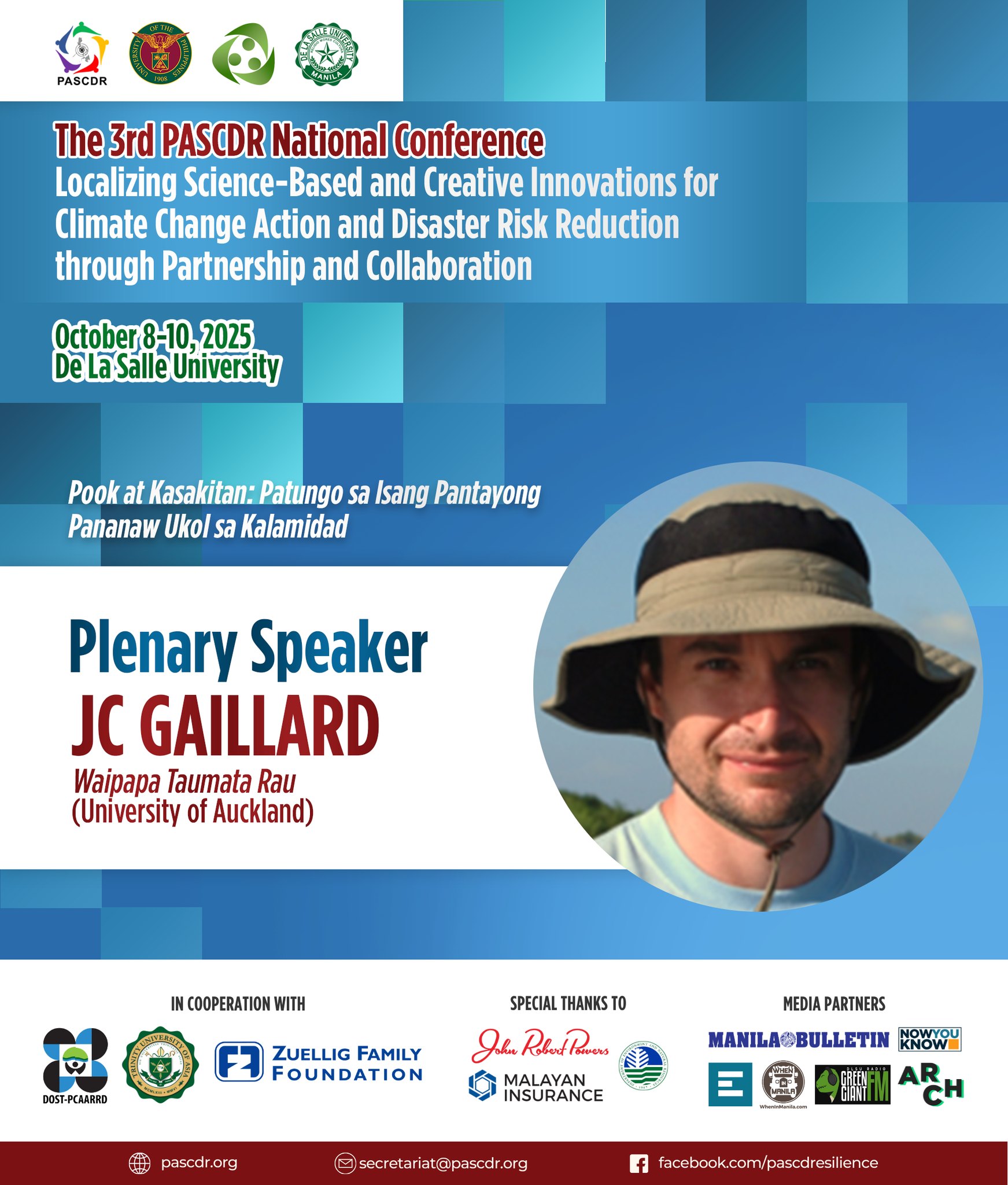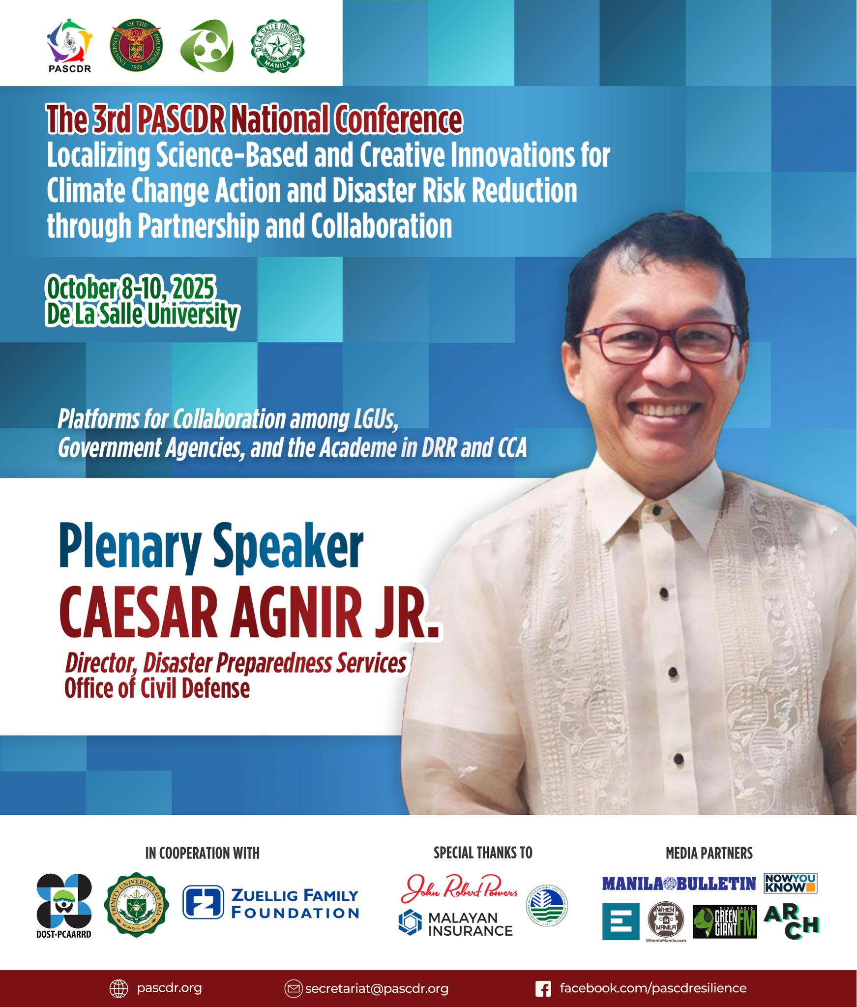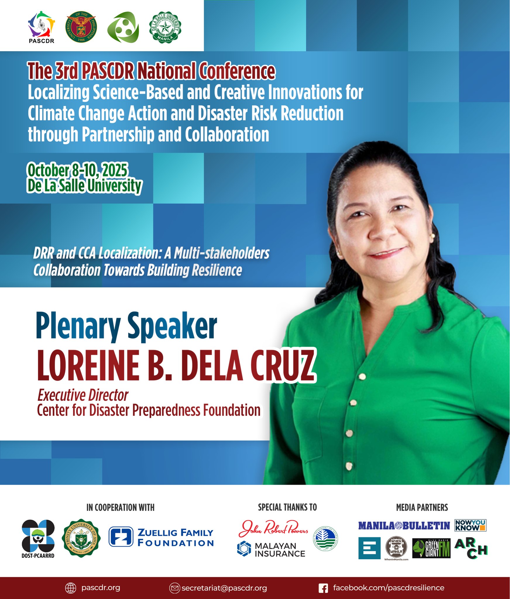 The 3rd PASCDR National Conference, happening this October 8โ€“10, 2025 at De La Salle University will unite voices from the academe, government, NGOs, and the private sector to spark transformative action for our communities. With the theme โ€œ๐—Ÿ๐—ผ๐—ฐ๐—ฎ๐—น๐—ถ๐˜‡๐—ถ๐—ป๐—ด ๐—ฆ๐—ฐ๐—ถ๐—ฒ๐—ป๐—ฐ๐—ฒ-๐—•๐—ฎ๐˜€๐—ฒ๐—ฑ ๐—ฎ๐—ป๐—ฑ ๐—–๐—ฟ๐—ฒ๐—ฎ๐˜๐—ถ๐˜ƒ๐—ฒ ๐—œ๐—ป๐—ป๐—ผ๐˜ƒ๐—ฎ๐˜๐—ถ๐—ผ๐—ป๐˜€ ๐—ณ๐—ผ๐—ฟ ๐—–๐—น๐—ถ๐—บ๐—ฎ๐˜๐—ฒ ๐—–๐—ต๐—ฎ๐—ป๐—ด๐—ฒ ๐—”๐—ฐ๐˜๐—ถ๐—ผ๐—ป ๐—ฎ๐—ป๐—ฑ ๐——๐—ถ๐˜€๐—ฎ๐˜€๐˜๐—ฒ๐—ฟ ๐—ฅ๐—ถ๐˜€๐—ธ ๐—ฅ๐—ฒ๐—ฑ๐˜‚๐—ฐ๐˜๐—ถ๐—ผ๐—ป ๐—ง๐—ต๐—ฟ๐—ผ๐˜‚๐—ด๐—ต ๐—ฃ๐—ฎ๐—ฟ๐˜๐—ป๐—ฒ๐—ฟ๐˜€๐—ต๐—ถ๐—ฝ ๐—ฎ๐—ป๐—ฑ ๐—–๐—ผ๐—น๐—น๐—ฎ๐—ฏ๐—ผ๐—ฟ๐—ฎ๐˜๐—ถ๐—ผ๐—ป,โ€ our distinguished speakers will share transformative insights that emphasize the importance of partnerships and collaboration in building a more resilient future.