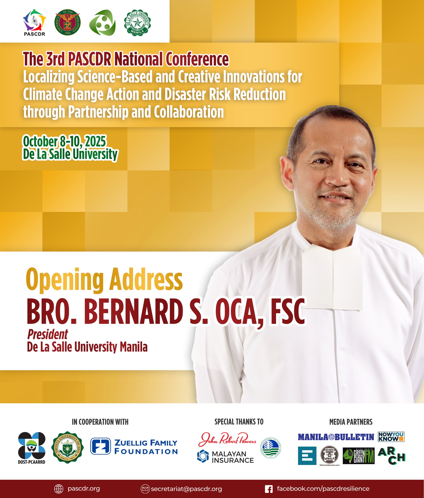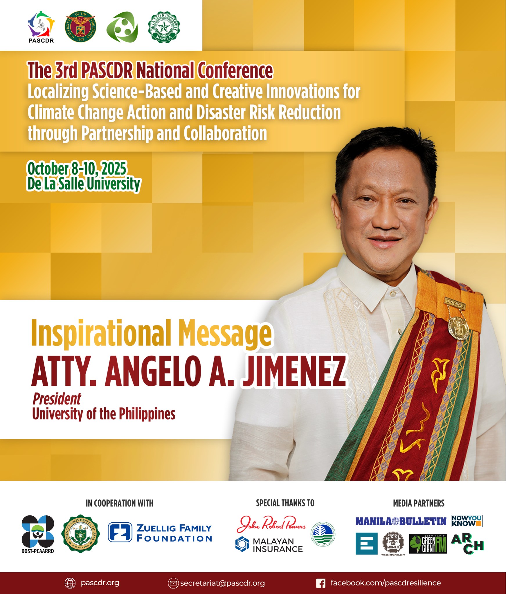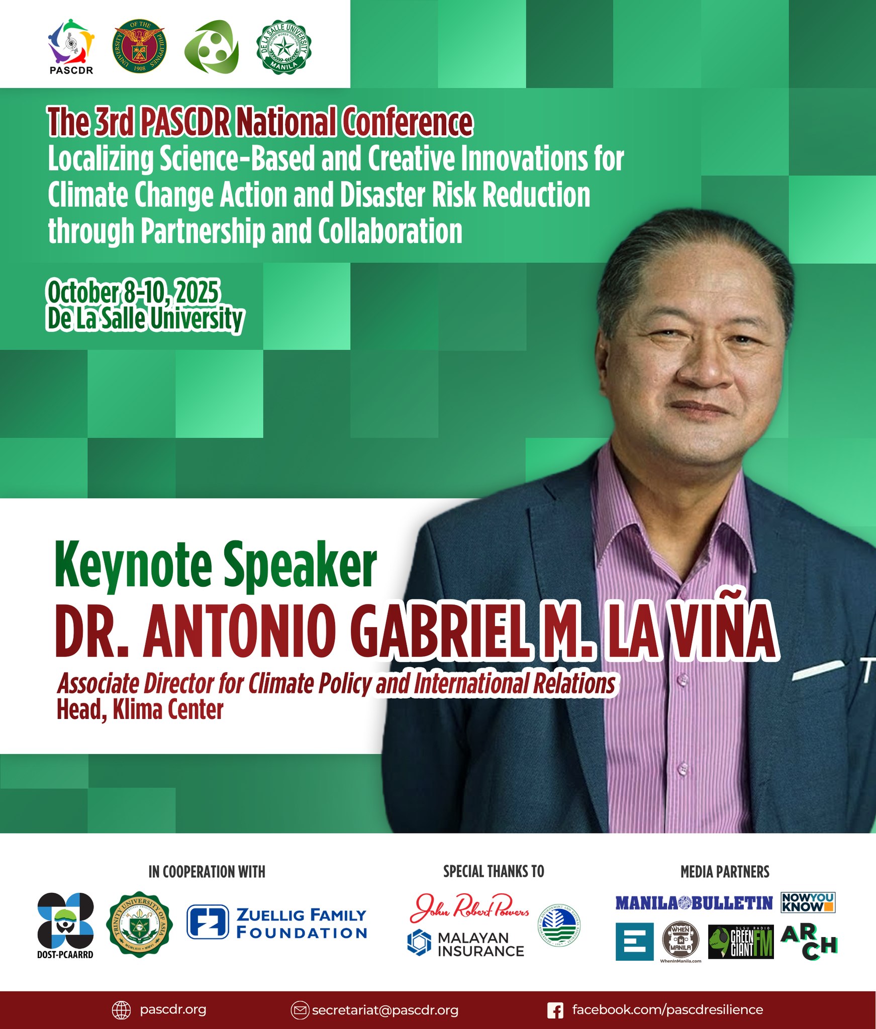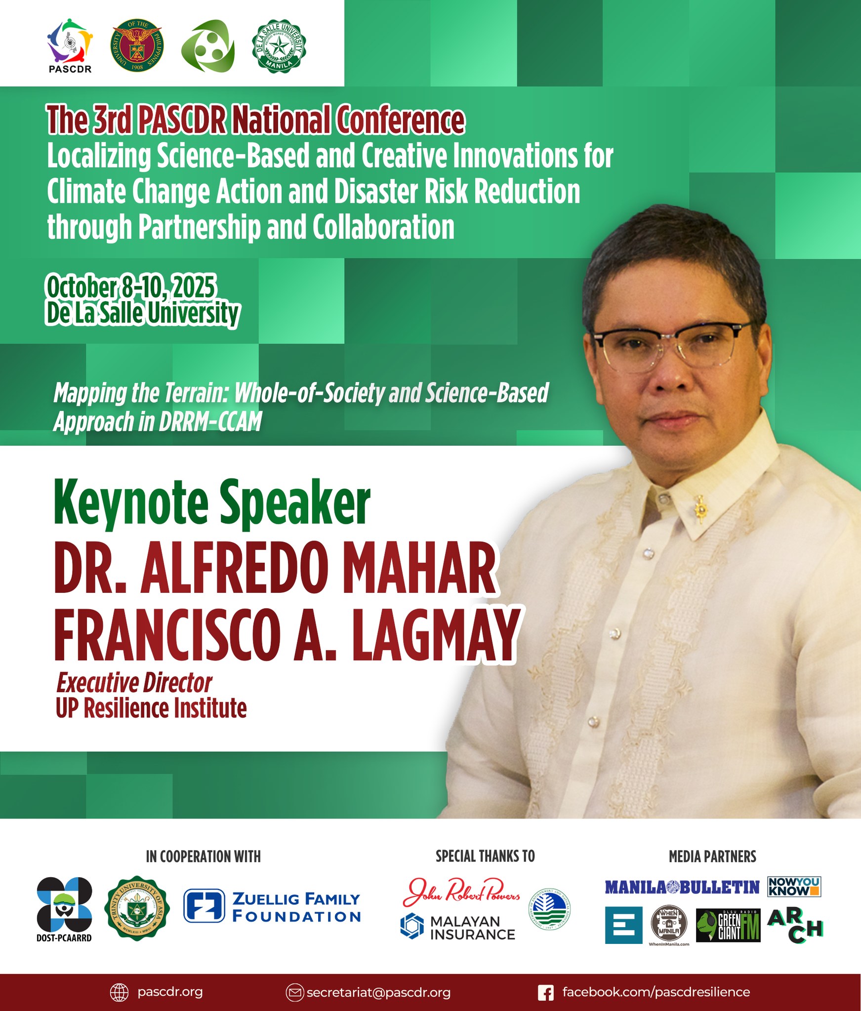 The 3rd PASCDR National Conference, happening this October 8โ€“10, 2025 at De La Salle University will unite voices from the academe, government, NGOs, and the private sector to spark transformative action for our communities. With the theme โ€œ๐—Ÿ๐—ผ๐—ฐ๐—ฎ๐—น๐—ถ๐˜‡๐—ถ๐—ป๐—ด ๐—ฆ๐—ฐ๐—ถ๐—ฒ๐—ป๐—ฐ๐—ฒ-๐—•๐—ฎ๐˜€๐—ฒ๐—ฑ ๐—ฎ๐—ป๐—ฑ ๐—–๐—ฟ๐—ฒ๐—ฎ๐˜๐—ถ๐˜ƒ๐—ฒ ๐—œ๐—ป๐—ป๐—ผ๐˜ƒ๐—ฎ๐˜๐—ถ๐—ผ๐—ป๐˜€ ๐—ณ๐—ผ๐—ฟ ๐—–๐—น๐—ถ๐—บ๐—ฎ๐˜๐—ฒ ๐—–๐—ต๐—ฎ๐—ป๐—ด๐—ฒ ๐—”๐—ฐ๐˜๐—ถ๐—ผ๐—ป ๐—ฎ๐—ป๐—ฑ ๐——๐—ถ๐˜€๐—ฎ๐˜€๐˜๐—ฒ๐—ฟ ๐—ฅ๐—ถ๐˜€๐—ธ ๐—ฅ๐—ฒ๐—ฑ๐˜‚๐—ฐ๐˜๐—ถ๐—ผ๐—ป ๐—ง๐—ต๐—ฟ๐—ผ๐˜‚๐—ด๐—ต ๐—ฃ๐—ฎ๐—ฟ๐˜๐—ป๐—ฒ๐—ฟ๐˜€๐—ต๐—ถ๐—ฝ ๐—ฎ๐—ป๐—ฑ ๐—–๐—ผ๐—น๐—น๐—ฎ๐—ฏ๐—ผ๐—ฟ๐—ฎ๐˜๐—ถ๐—ผ๐—ป,โ€ our distinguished speakers will share transformative insights that emphasize the importance of partnerships and collaboration in building a more resilient future.